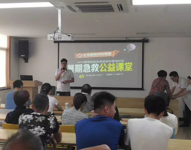 提高全民的急救意识和急救常识,不仅仅是国家、城市、政府的责任,也是社会和全民目前最紧急、最迫切的责任。2019年7月6日,义乌微创外科医院走进了兴业社区,为学员们进行“心肺复苏术”急救知识培训。通过给学员们讲解如何进行救护等急救知识,以此加强学员们急救意识,掌握紧急事件、急病发生的急救措施,提高学员们自救自护的能力。